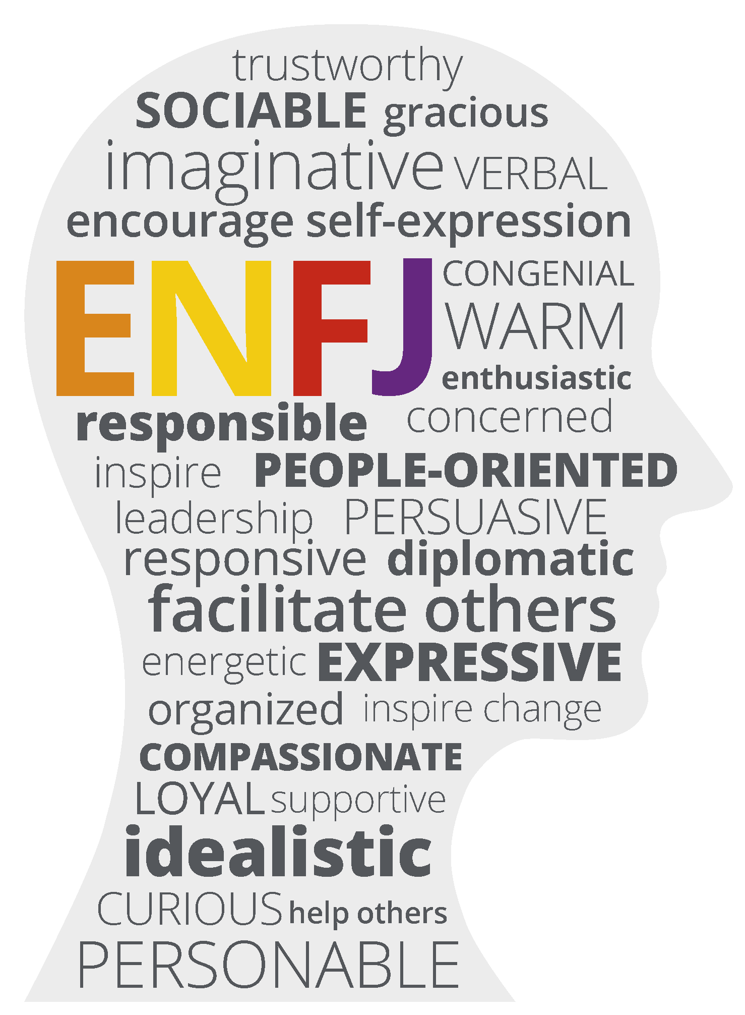 People with ENFJ preferences tend to be organized and people-focused. Imaginative, trustworthy, sociable, and persuasive, they’re often great at creating harmony, encouraging self-expression, and inspiring others.