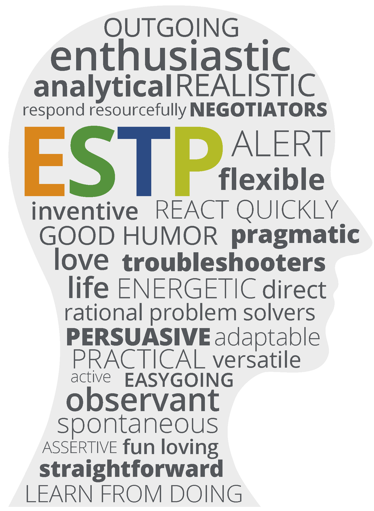 People with ESTP preferences tend to be flexible, adaptable, resourceful, and pragmatic.