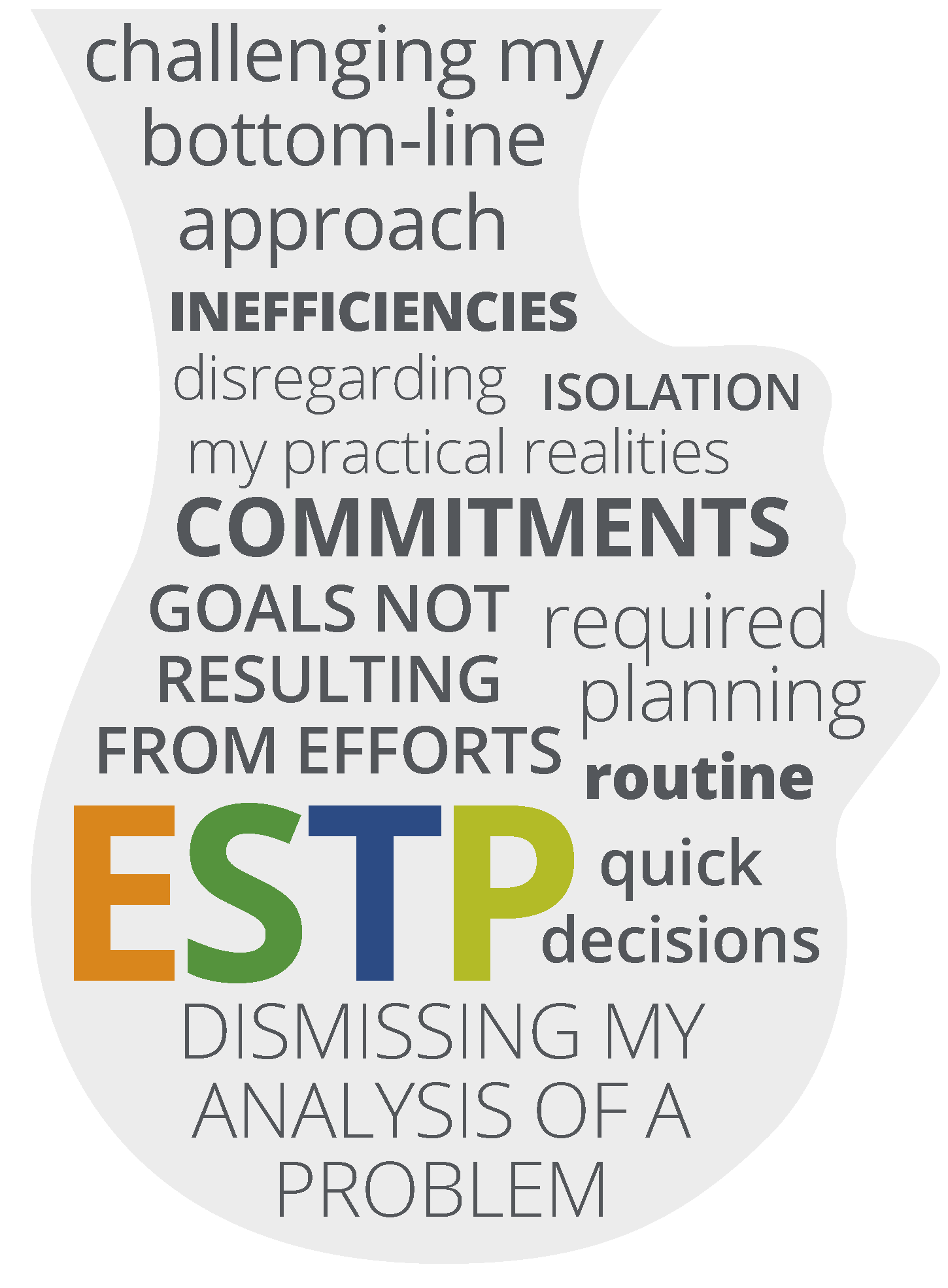On a team, ESTPs might frustrate others by improvising too often, taking risks, and jumping in to things too quickly.
