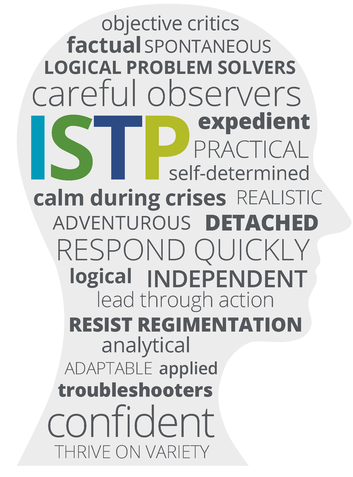 People with ISTP preferences tend to be pragmatic and realistic. They’re very aware of facts and unlikely to be convinced by anything but careful reasoning.